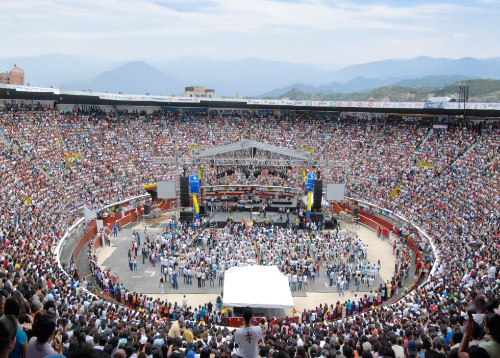 Vista panorámica desde las gradas de la Arena Cañaveralejo en Cali, llena de gente durante un concierto con un gran escenario montado en el centro del ruedo.