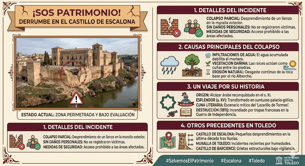 Aunque los técnicos de Patrimonio aún están evaluando los daños materiales, las primeras hipótesis apuntan a una combinación de humedades acumuladas y la erosión natural de la piedra. El Castillo de Escalona, que data del siglo XV en su configuración actual, se encuentra situado sobre un escarpe que domina el río Alberche, una ubicación que lo expone directamente a los elementos.